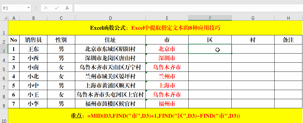- 第二个参数通过FIND函数查找“市”的位置,并加1得到“区”开始的位置。